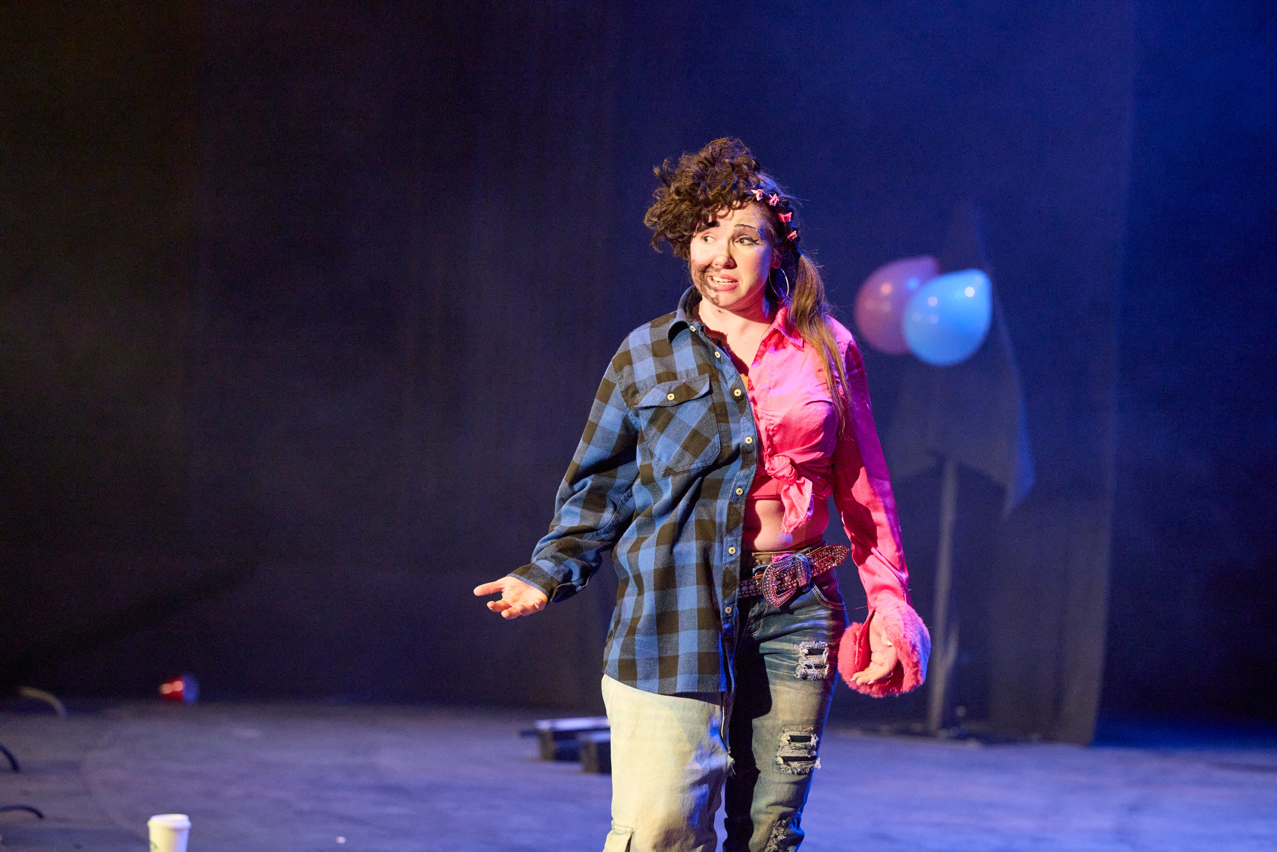 Palamides plays both the male and female protagonists, with one half of her body costumed as each, hurling herself around the huge stage and occasionally getting soaked, until she’s half naked and covered in God knows what.
